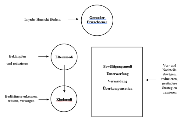 Nach der Erarbeitung der einzelnen Modi liegt der Fokus darauf, neue, gesunde Bewältigungsstrategien zu entwickeln und diese im Alltag zu verankern. Die Bewältigungsmodi werden angesprochen und etwaige Vor- und Nachteile sowie alternative Verhaltensweisen erarbeitet. Weiters werden die Gefühle der Kind-Modi (bspw. durch Rollenspiele oder Stuhldialoge) verarbeitet und verändert und die strengen Gedanken der dysfunktionalen Eltern-Modi entkräftigt. Dazu gehört, den gesunden Erwachsenenmodus aktiv einzusetzen, um die Bedürfnisse der Kind-Modi wahrzunehmen, innere Kritik zu relativieren und langfristig eine stabilere, mitfühlendere Beziehung zu sich selbst aufzubauen. So kann ein flexibleres und selbstbestimmteres Erleben entstehen.